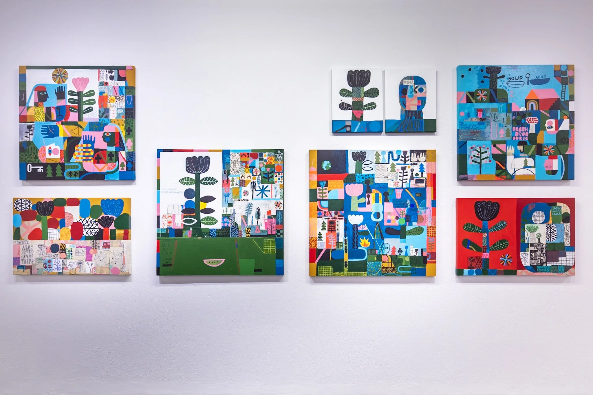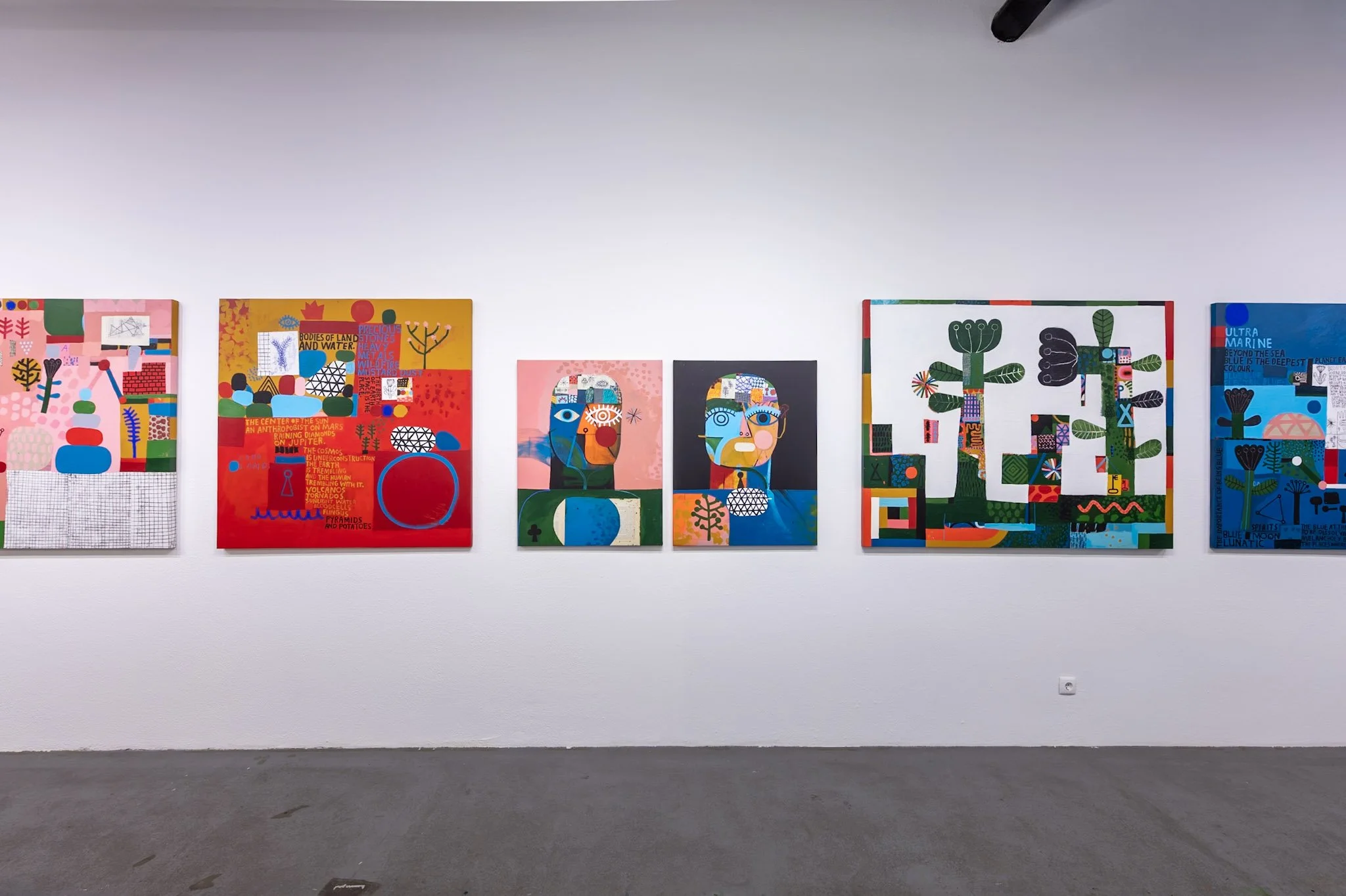 The structure of language, and the human capacity for abstract thinking constitute a fundamental layer of this exhibition. Shillinglaw is aware that he plays with language to construct reality — he creates new realms on canvas, loaded with visual codes to break and decipher. The artist draws attention to the semiotic properties of language that allow us to understand and name the reality we find ourselves in.