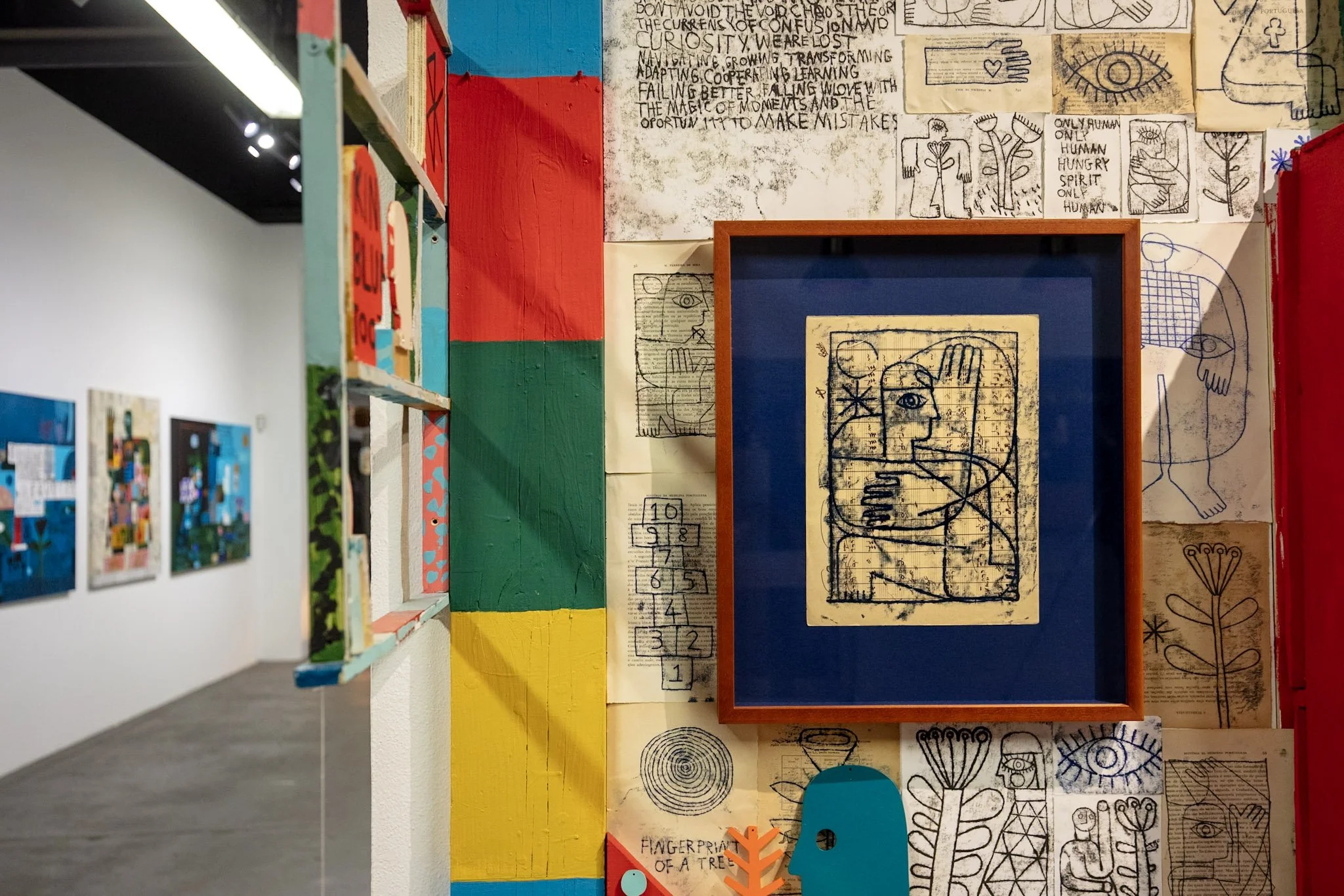 Monoprints are an integral part of Shillinglaw's artistic residency in Lisbon. These pieces embody the rhythm of trial and error, echoing the way humans grow through experimentation, mistakes, and reinvention. His works weave fragments of text with marks, images, and symbols, creating a powerful extension of the mind: an open terrain of memory and imagination.