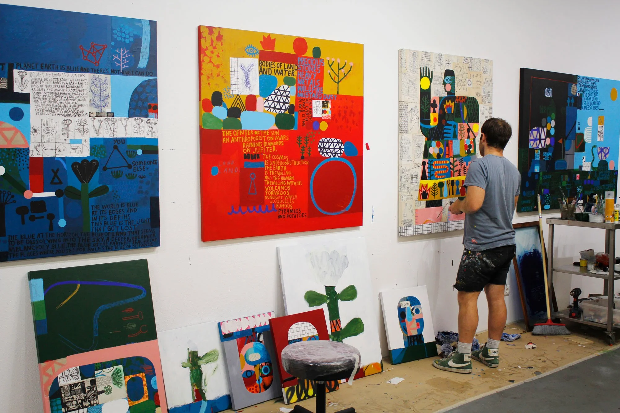 A estrutura da linguagem, e a capacidade humana para o pensamento abstrato, constituem uma camada fundamental desta exposição. Shillinglaw tem consciência de que joga com a linguagem para construir a realidade — cria novos mundos nas telas, carregados de códigos visuais para romper e decifrar. O artista chama a atenção para as propriedades semióticas da linguagem que nos permitem entender e nomear a realidade em que nos encontramos.
