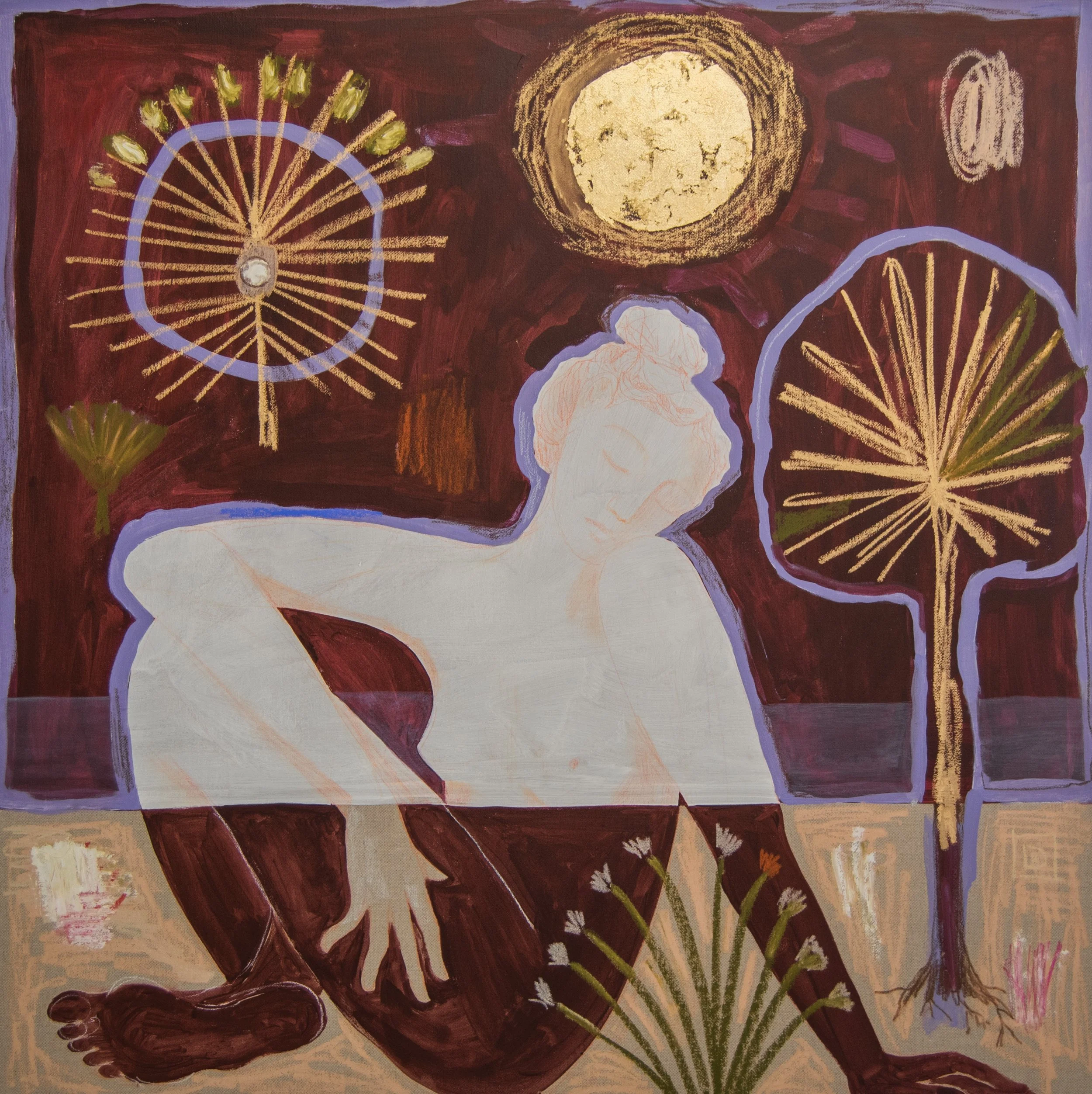 Solitary female figures, often nude and powerful in their vulnerability, inhabit vibrant oneiric scenes saturated with color. Eyes closed, they retreat inward, embodying contemplation and resilience. Around them roam wild creatures and felines — once symbols of inner demons, now transformed into companions and keepers of strength.
