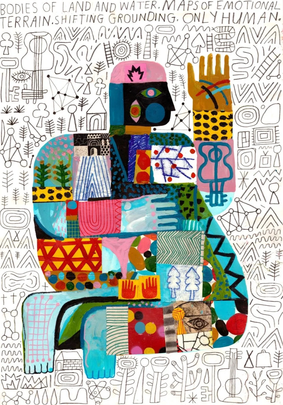 Using a unique visual language, the works celebrate vulnerability, humor, and the struggle with the very fact that we live in these chaotic and uncertain times. “We are both the problem and the solution,” says Shillinglaw, as he wrestles with the world, poking at paradoxes and leaning into ideas of forgiveness — of ourselves, the generations before us, and the generations to come — for the damage done to each other and to the planet. Empathy becomes the guiding force, drawing maps that use compassion as a compass.