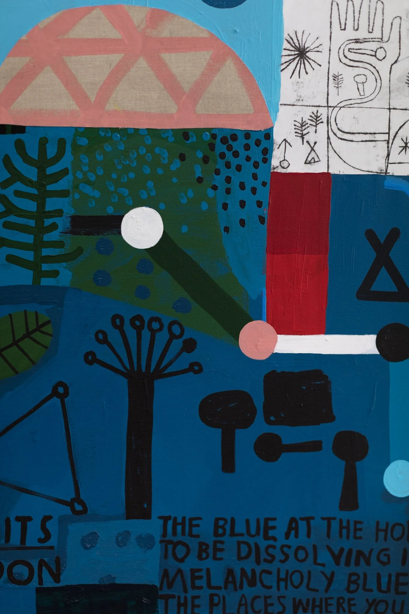 The exhibition transforms the gallery space into a curious and playful environment — echoes of snakes and ladders and ancient hieroglyphics, layered compositions become spaces to get lost in rather than windows to look through. Here, Shillinglaw builds up and breaks down borders and boundaries in a visual dance between destruction and construction, offering playful and poetic alternatives to the structures we have set in stone.